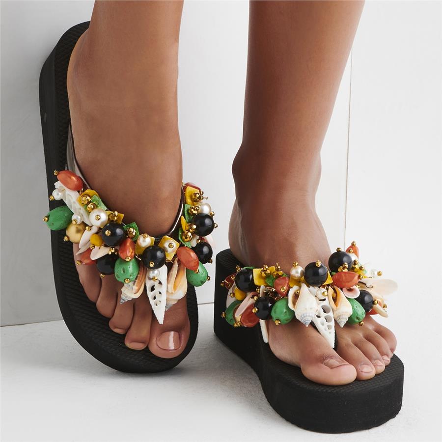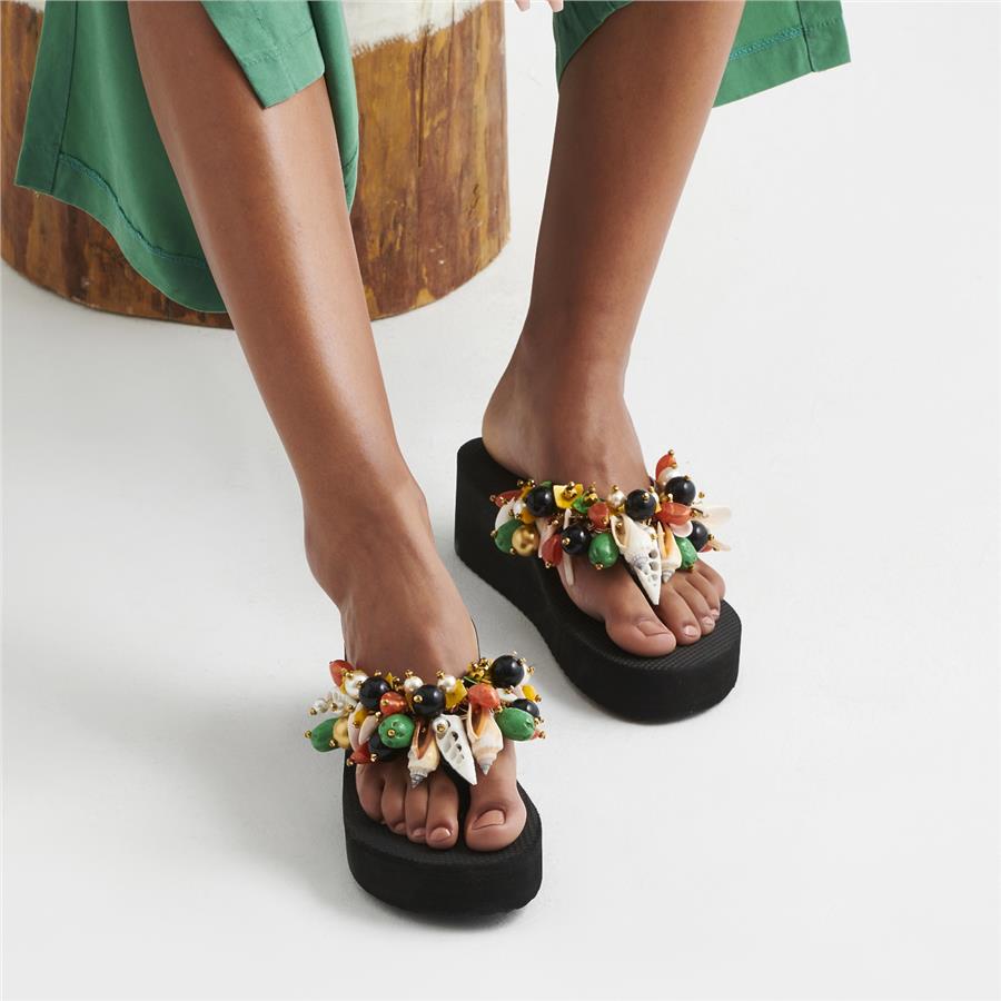 - Vibrant and exotic design featuring an elegant black EVA sole, gold top stripe, and stunning decorations in cream, black, red, and green tones